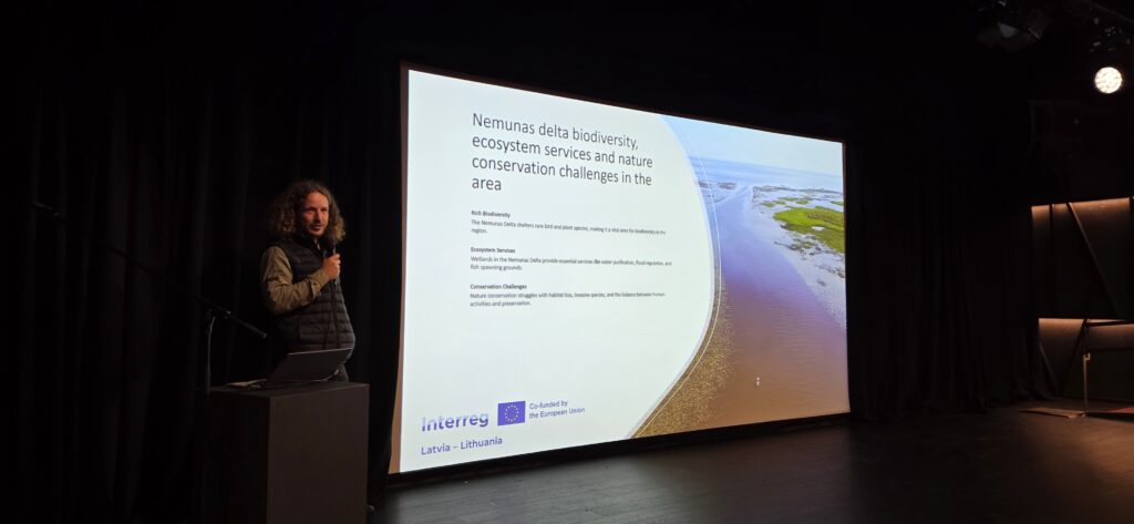 The conference not only presented the project but also discussed environmental challenges, biodiversity conservation, the necessity of ecosystem restoration, and the importance of nature protection. In Karolina Bernotienė’s presentation “Nature-Based Solutions in the Development of Tourism in Šilutė”, nature-based solutions for sustainable tourism development were discussed, while Boris Belchev’s presentation “Biodiversity, Ecosystem Services, and Conservation Challenges in the Nemunas Delta Region” provided a broader ecological context for the project’s activities.