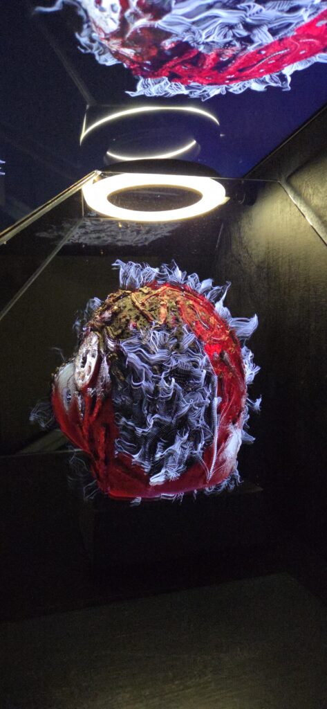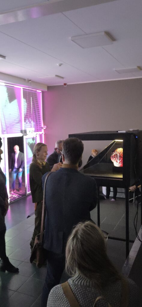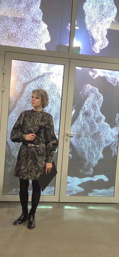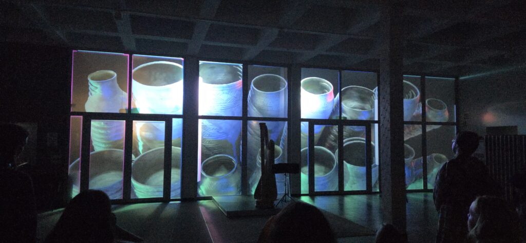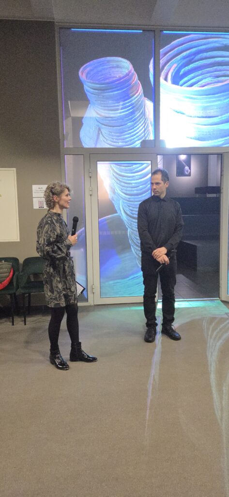 At the heart of the exhibition is a 3D video installation created by the Lithuanian video artist Rimas Sakalauskas. His work was inspired by the ceramic artworks of Kristina Motuzienė and Ramunė Pranckevičiūtė. In a large-scale projection, viewers can observe how ceramics are transformed in a digital environment – through moving lines, lights, textures, and rhythms. This audiovisual experience evokes the feeling that clay and sound merge into one unified “meta-ceramic” world.